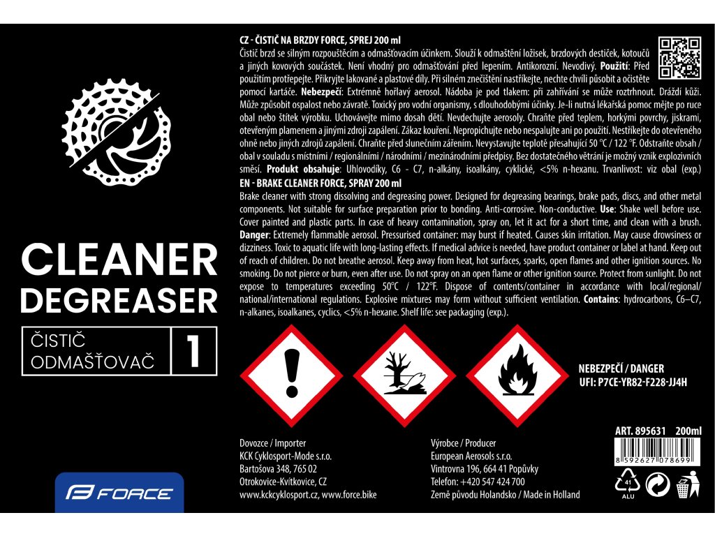 FORCE čistič na brzdy je rychle působící sprej, který efektivně rozpouští a odstraňuje mastnoty, oleje a nečistoty z kovových částí vašeho kola. Je ideální pro údržbu brzdových kotoučů, destiček, ložisek a dalších kovových komponentů.