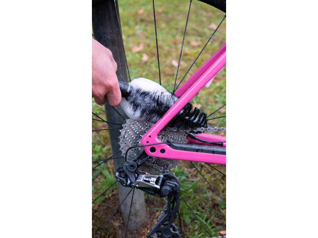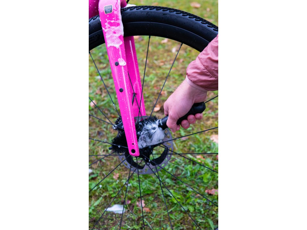 Kartáč ve tvaru kužele je vybaven odolnými nylonovými štětinami a díky svému zúženému tvaru se snadno dostane i do těžko přístupných částí rámu. Skvěle poslouží při detailním mytí kola, kde běžné kartáče nestačí.