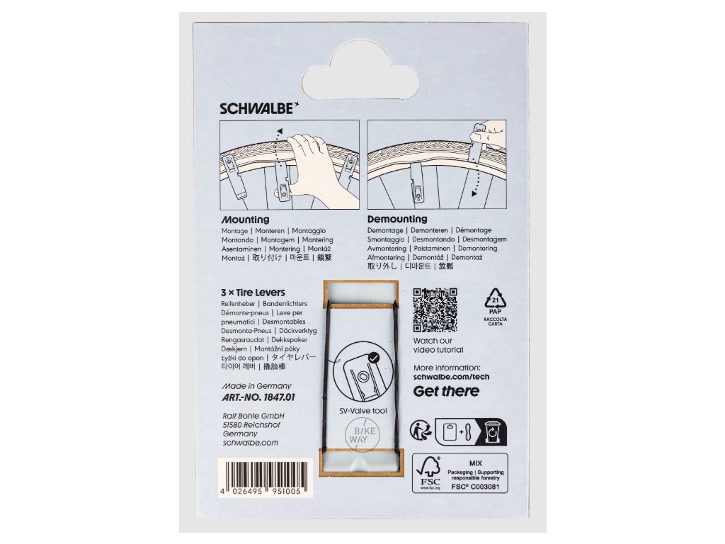 Montpáky Schwalbe jsou praktickým pomocníkem pro rychlé a pohodlné přezouvání plášťů. Díky promyšlenému tvaru a povrchové úpravě umožňují velmi komfortní montáž i demontáž pláště, a to bez zbytečné námahy.