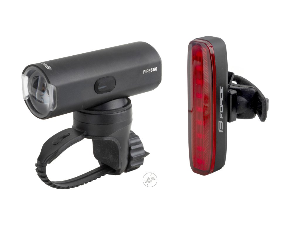 Sada světel FORCE PIPE USB kombinuje přední světlo 550 lm pro bezpečnou viditelnost a zadní blikačku 50 lm pro maximální viditelnost v provozu. Obě světla jsou vybavena dobíjením přes USB-C, integrovanou baterií a indikací stavu nabití.